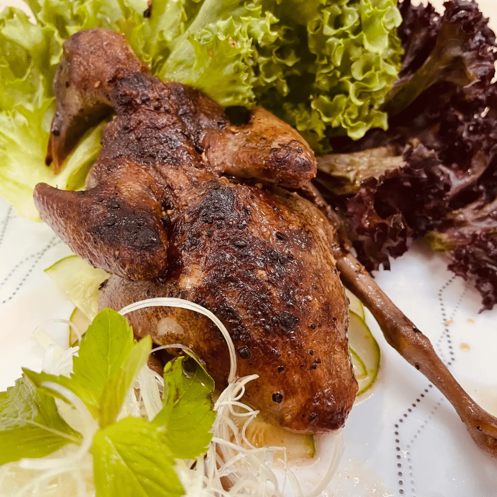 越南🇻🇳 野鴿-越南 2025-02-05 / 在超市看到👀的野味,買來料理啦! 肉真的不多主要集中在胸部的那二塊,肉色深紅可以想像野味應該滿足的,有在運動的肉質油脂量少,取下胸骨和頸骨做肉汁醬,只以簡單的胡椒塩醃一下,使用平底鍋加蓋煎,因為脂肪少所以熟度要注意⚠️不要過熟肉會太乾! 食用時肉的味道果然野味足,肉質細緻有點像是比較柔軟細膩的鴨肉,配上辣味肉汁很剛好,不過黑胡椒醃肉沒去掉表面會黑掉⋯!